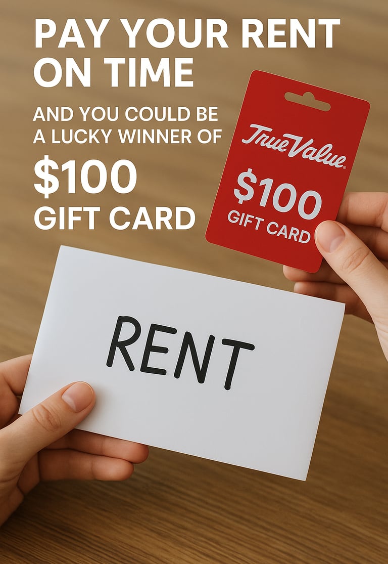 When you pay your rent on time, you’re not just staying on top of your housing — you’re also getting a chance to win! Each month, we’ll select one lucky on-time payer to receive a $100 True Value gift card. It’s our way of saying thank you for being a responsible and valued tenant.
